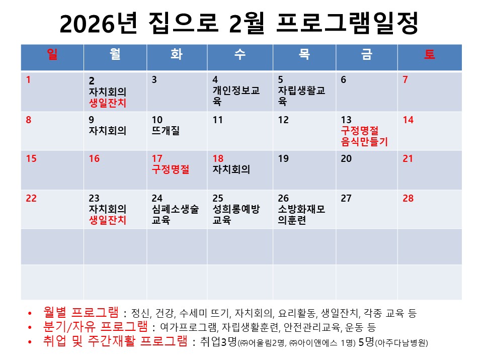 [공지사항] 2026년 2월 집으로공동생활가정 프로그램 일정 안내